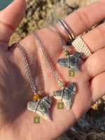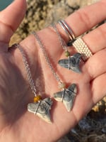a variety of shark teeth, found in Jupiter FL, wire wrapped and attached to either silver chain