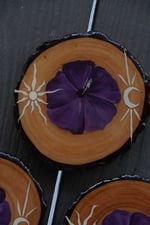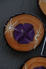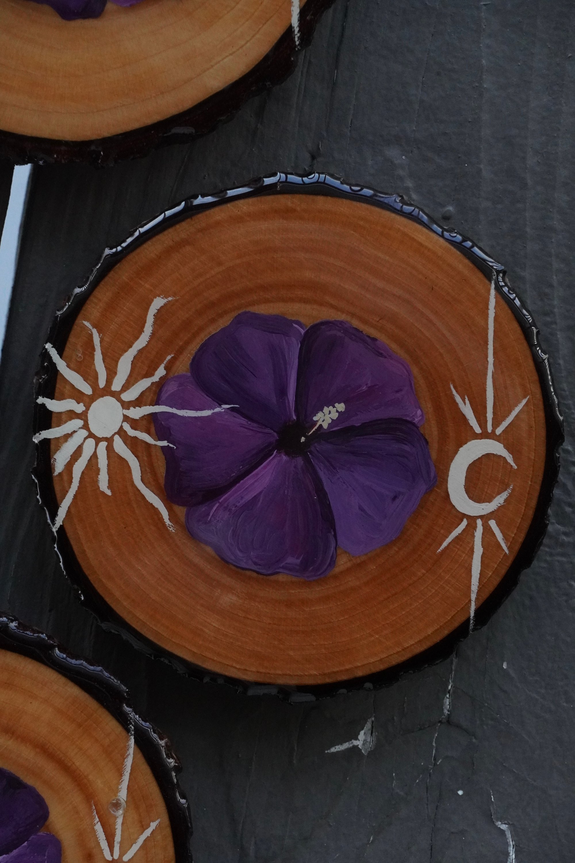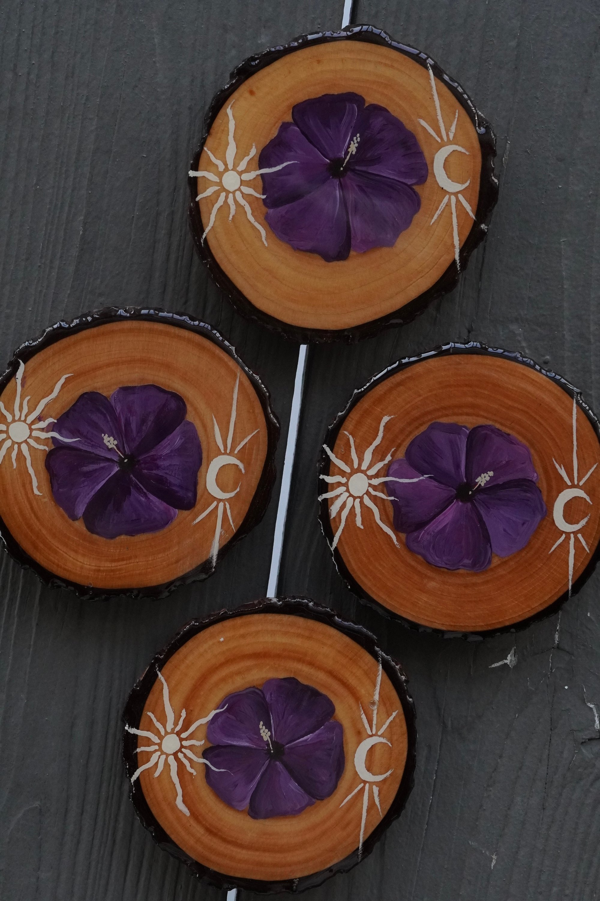 each coaster offers an original painting on a raw edge, wooden slab. layered with acrylic paint and resign for a 3D effect. 100% water proof 🌺