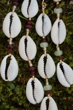 made with natural cowrie sea shells, glass seed beads, natural jade beads & gold filled materials. *tarnish resistant*