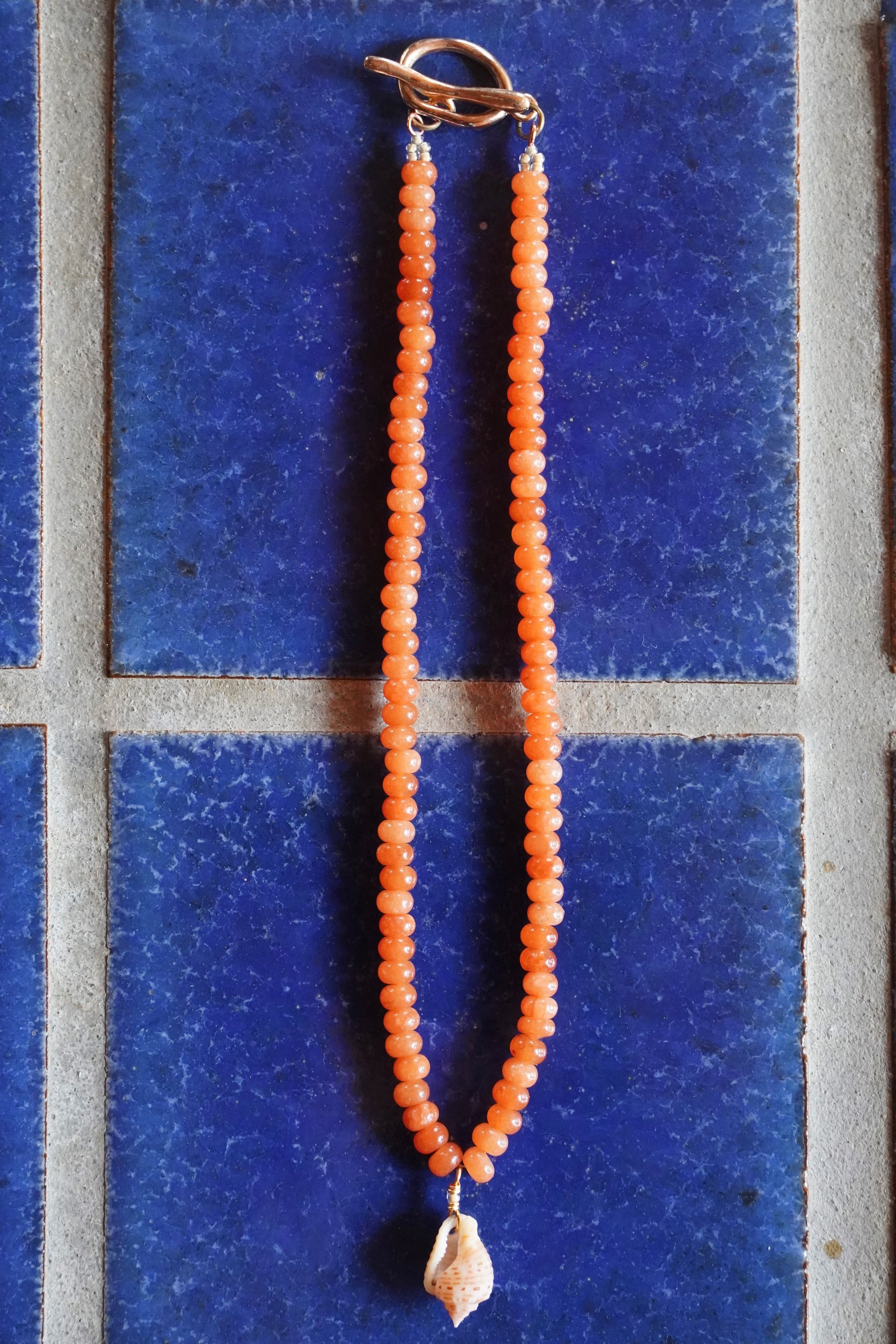 this necklace is made with glass seed beads, natural jade beads & a Puerto Rican sea shell- finished with a gold filled toggle clasp! *tarnish resistant*