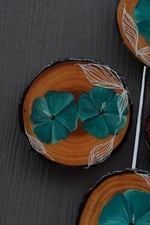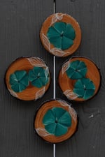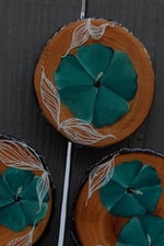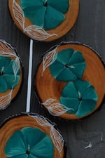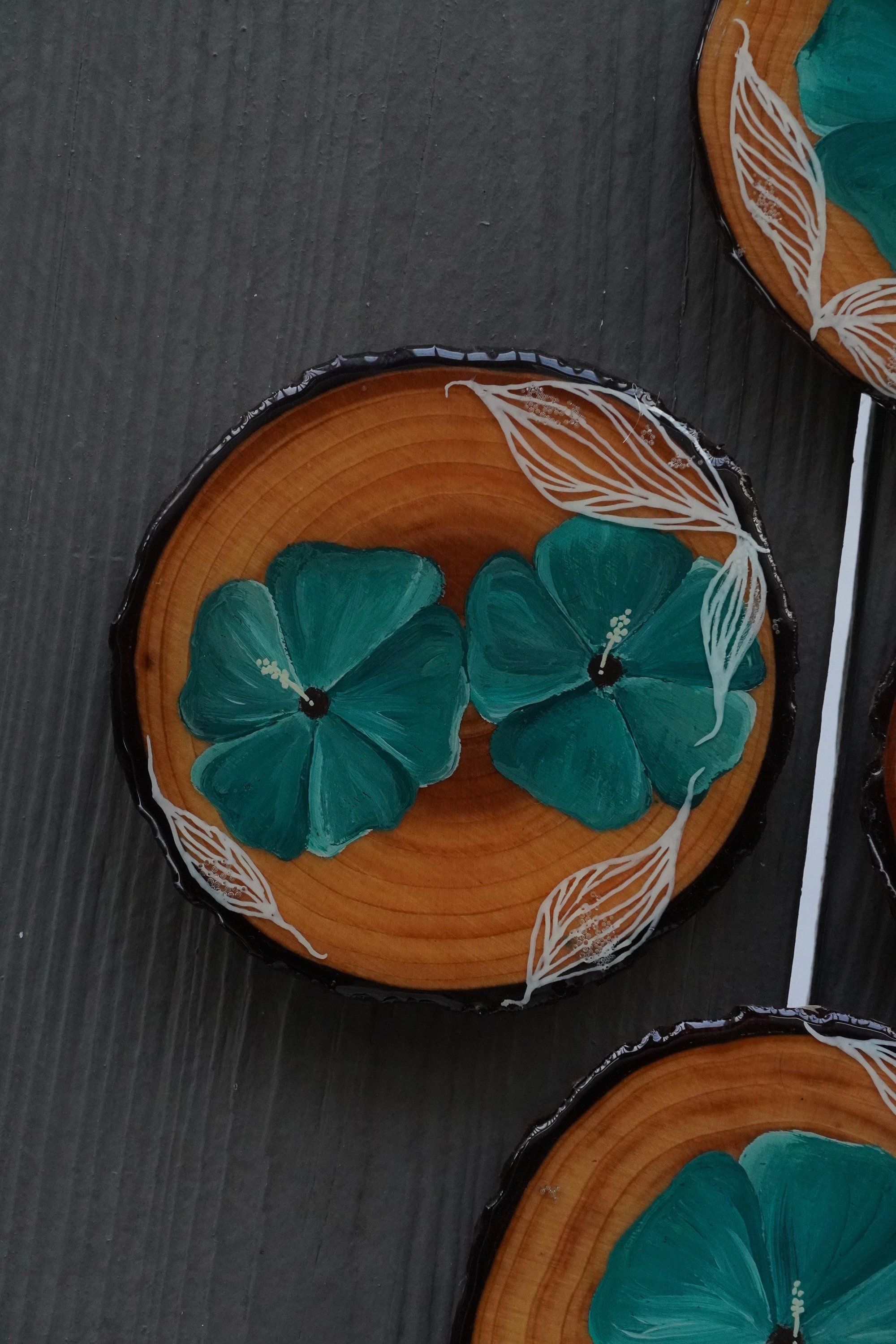 each coaster offers an original painting on a raw edge, wooden slab. layered with acrylic paint and resign for a 3D effect. 100% water proof 🌺