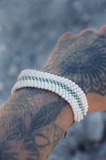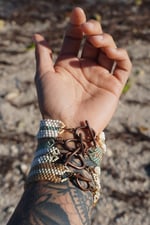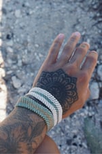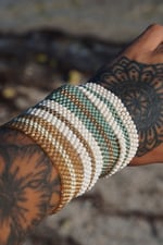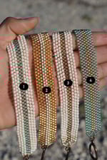 this is a hand stitched bracelet made with durable beading thread (similar to fishing line) & glass beads. the technique used is called a peyote stitch, where I hand sew each bead together rather than using a beading loom (my technique is a slower process but more fulfilling for me!)