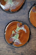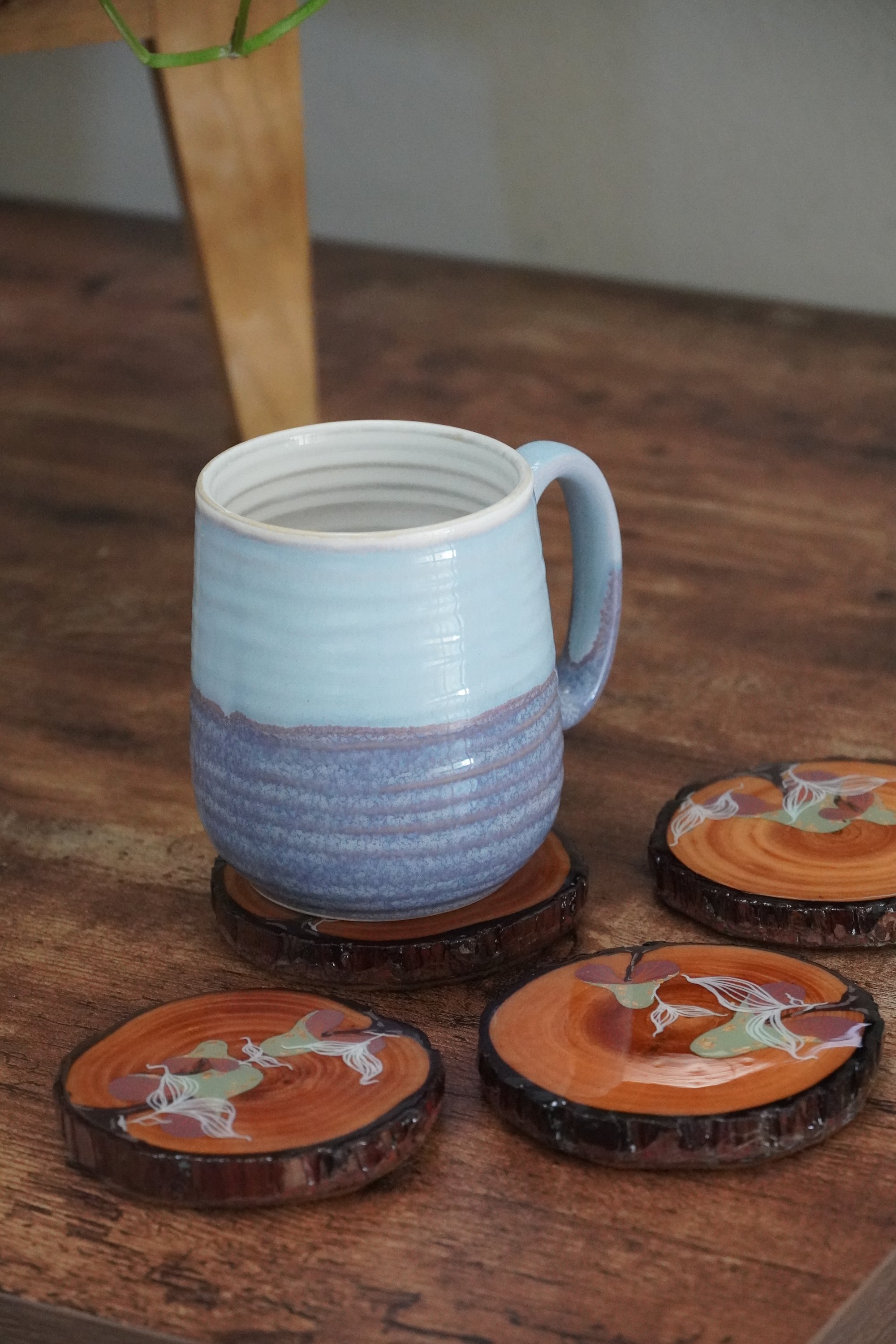 each coaster offers an original painting on raw edge, wooden slabs. layered with acrylic paint and resign for a 3D effect, and to protect the wood from water and condensation ššāš«