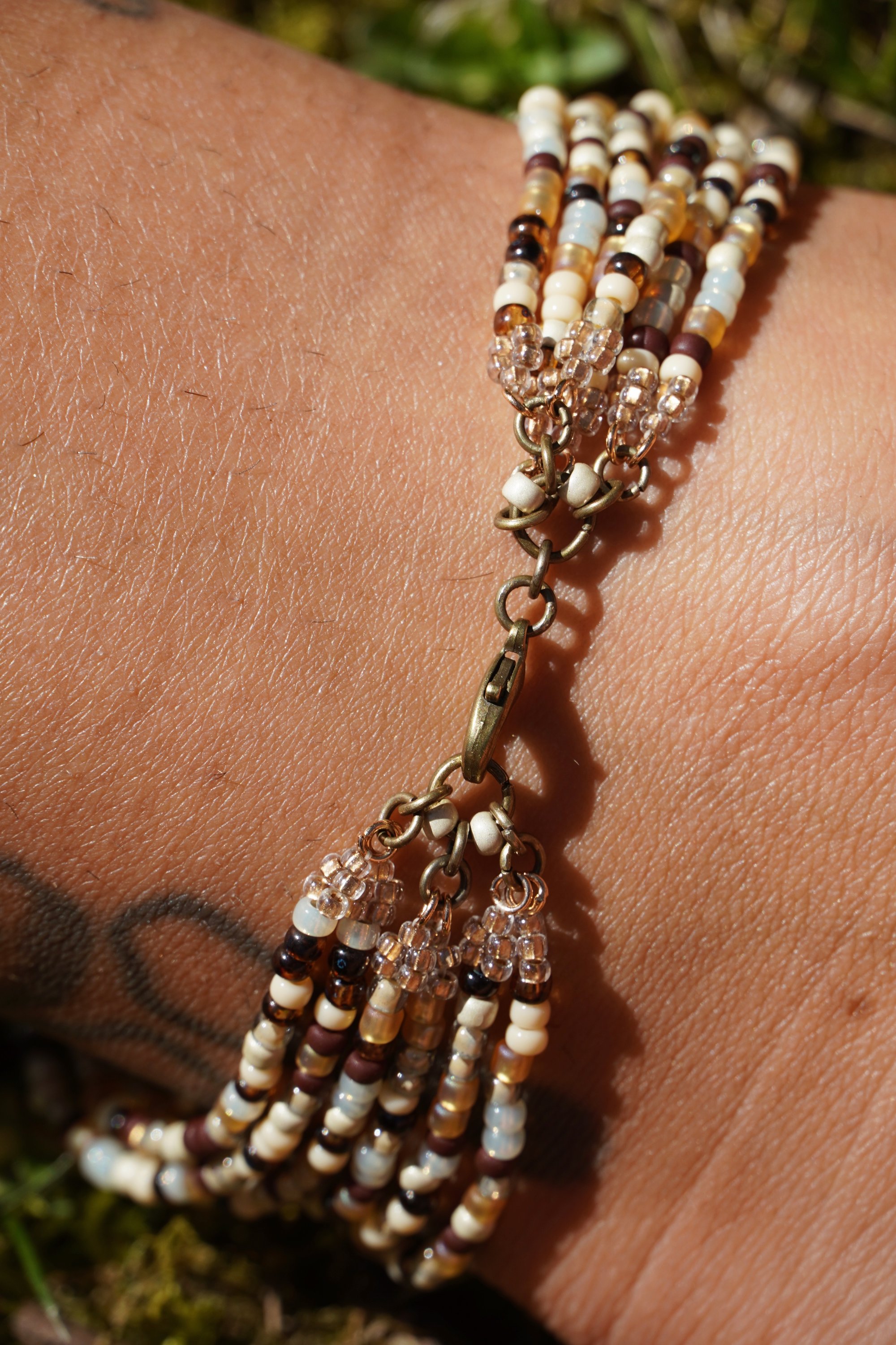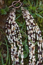 these are made with glass seed beads & copper materials.