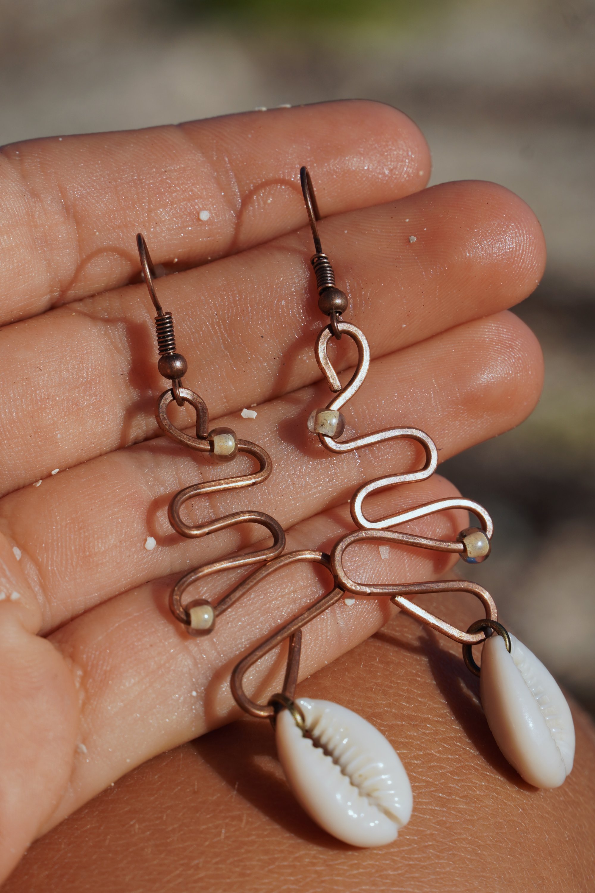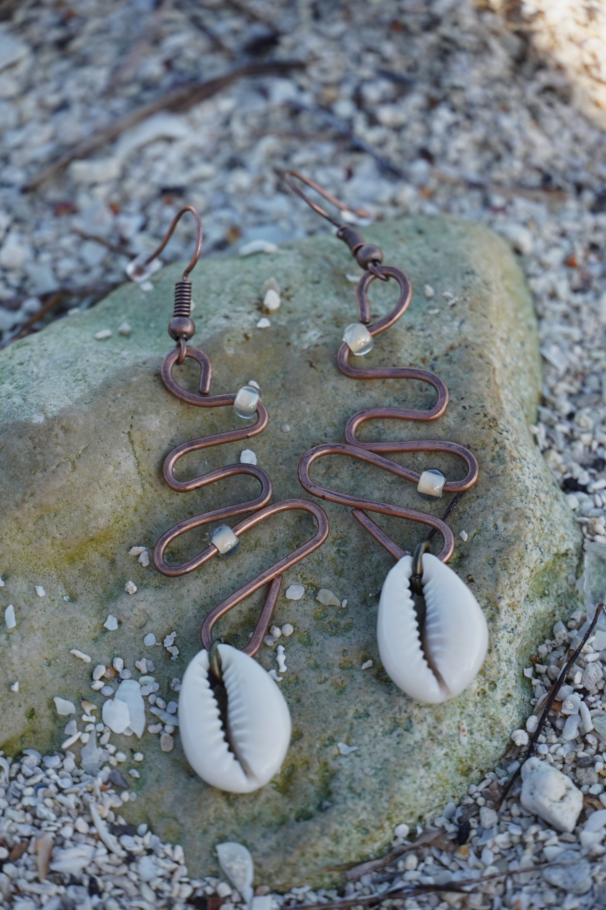 one of one earrings. made with natural sea shells, glass beads & copper. these earrings are a perfect balance of elegant and bold. add them to any outfit and enjoy Earth's treasures š