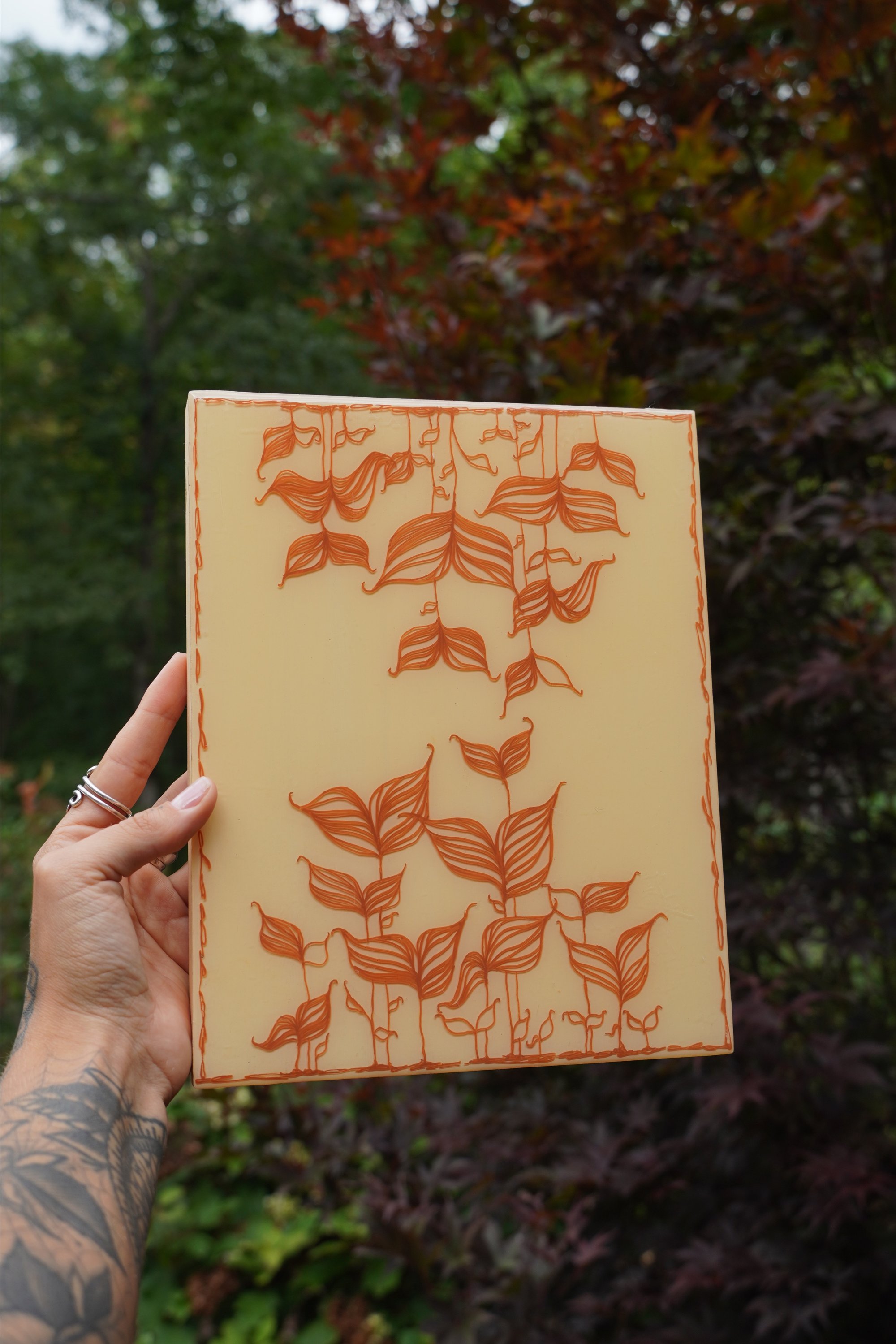 base color (cream) is painted with acrylic and topped with a coat of resin. leaves are painted on top of the resin for a 3D effect, then coated with a 2nd layer of resin.