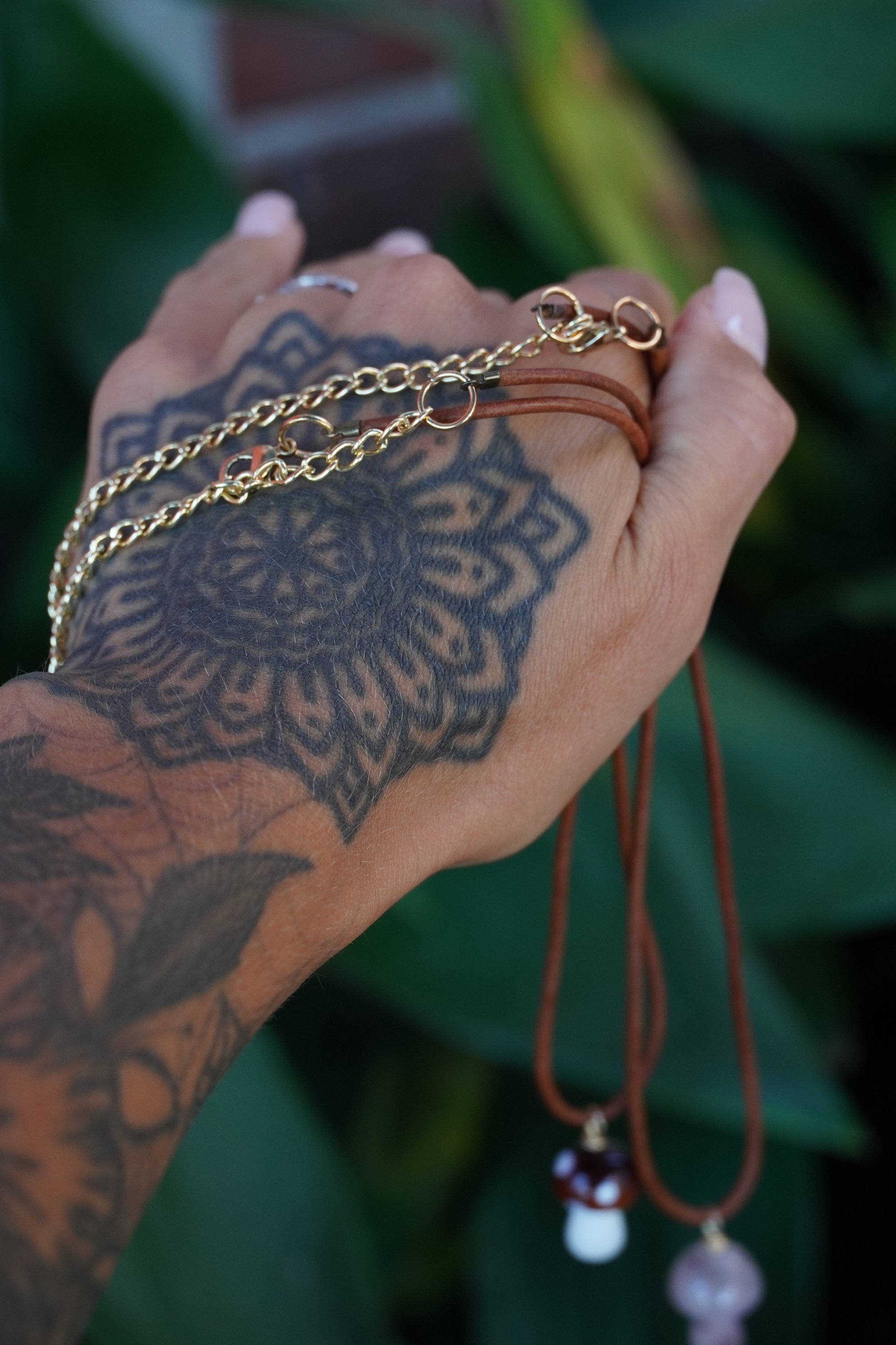 glass mushrooms on leather cord necklaces. tarnish resistant materials so you never have to take them off ;)