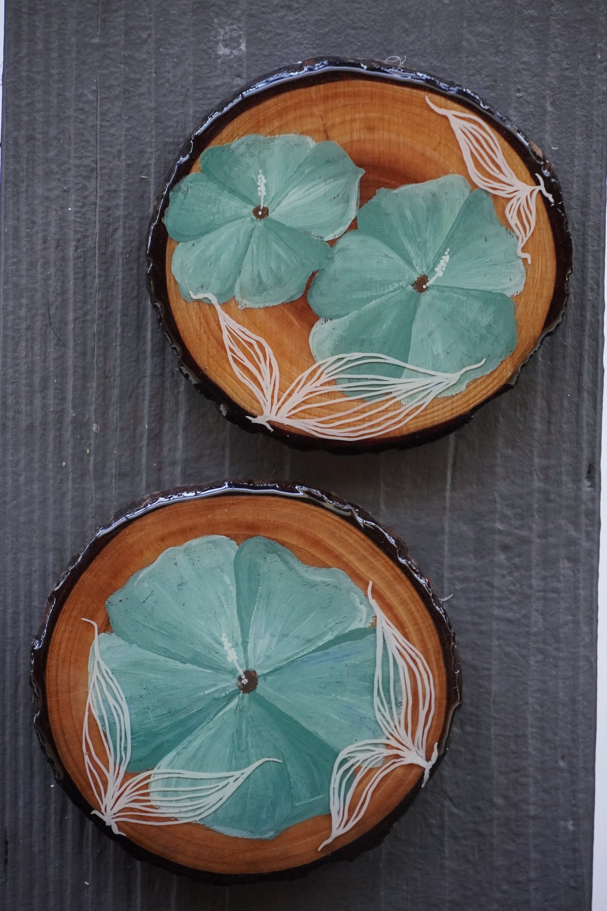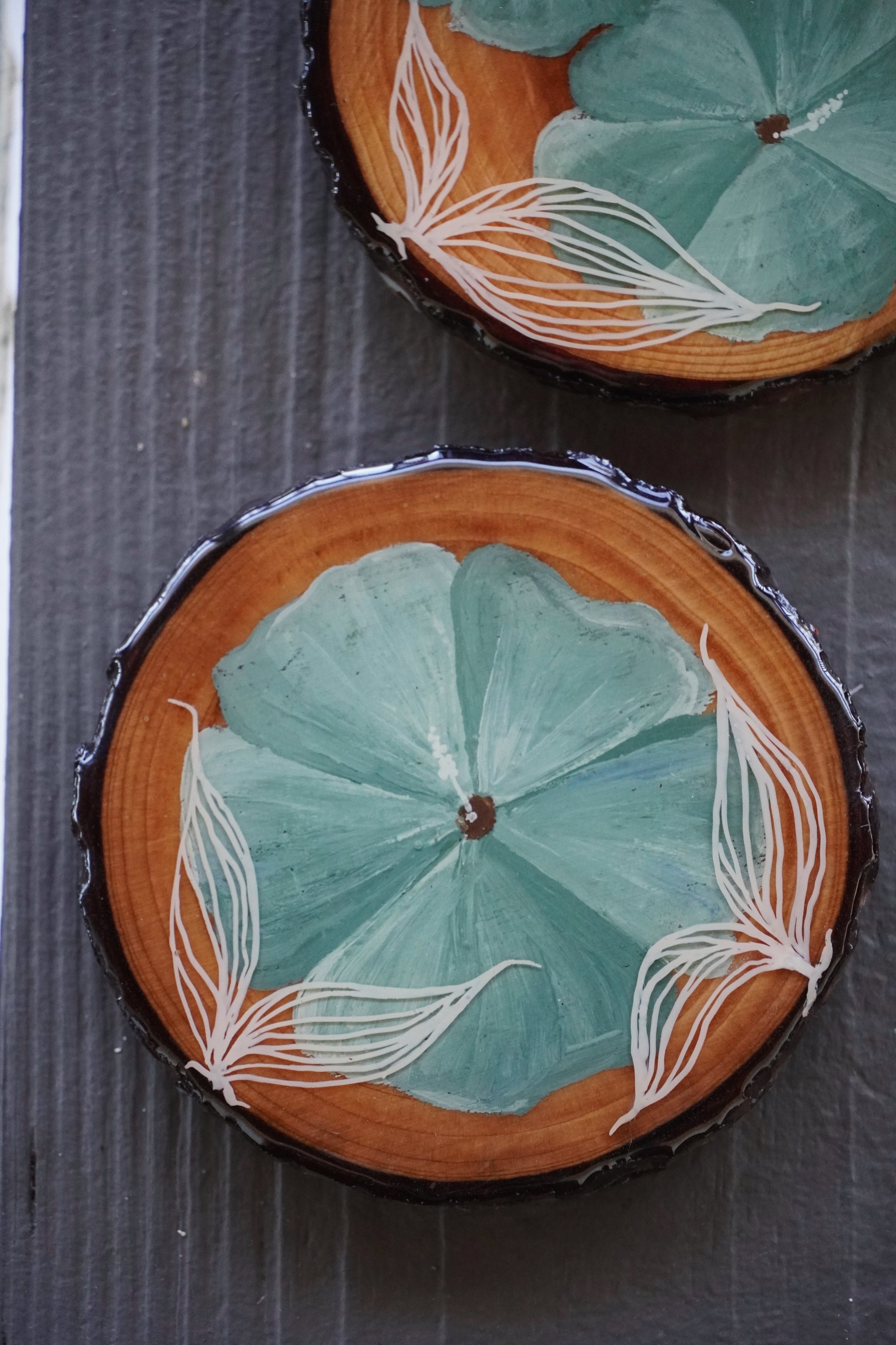 each coaster offers an original painting on a raw edge, wooden slab. layered with acrylic paint and resign for a 3D effect. 100% water proof 🌺