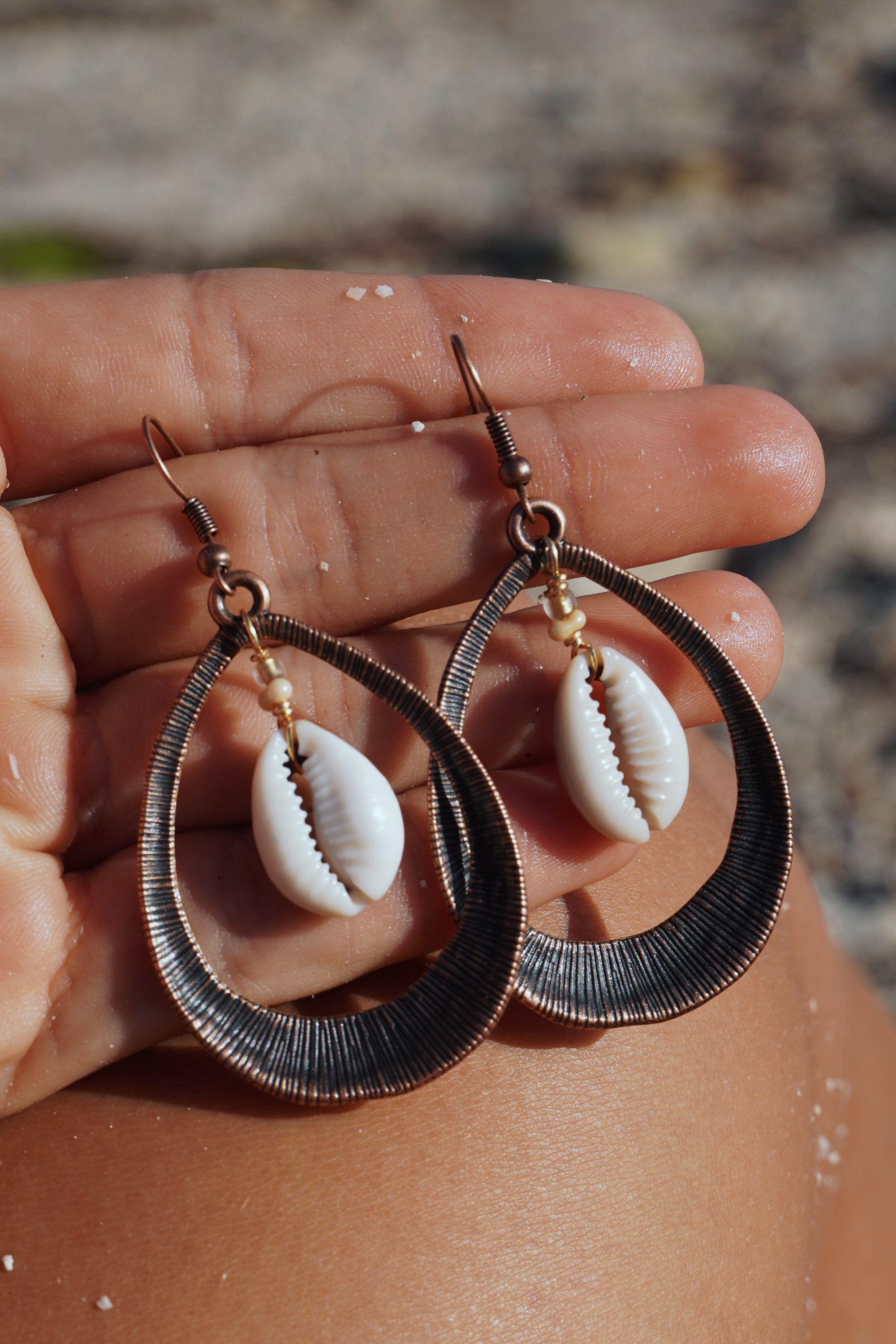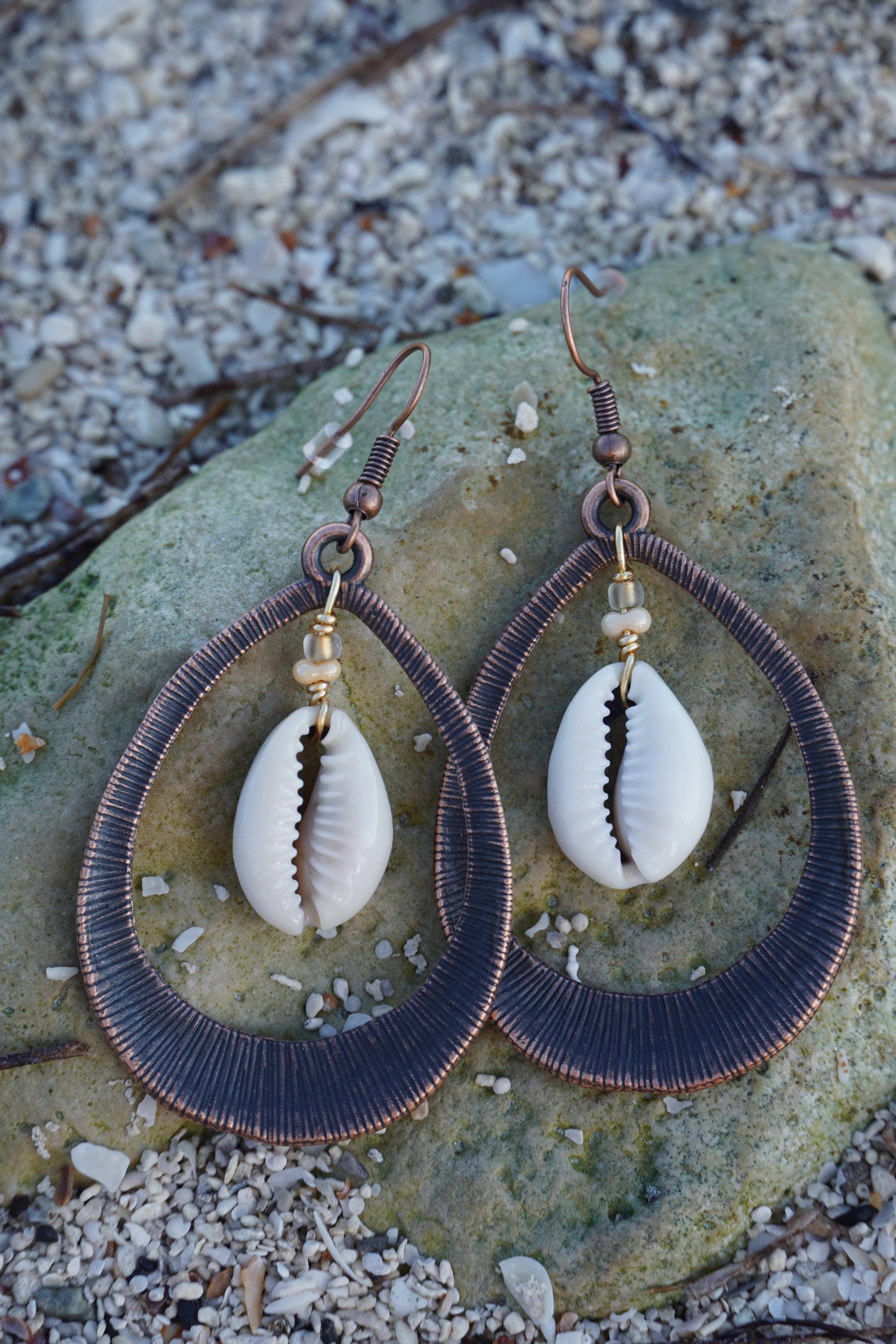one of one earrings. made with natural sea shells, glass beads & copper. these earrings are a perfect balance of elegant and bold. add them to any outfit and enjoy Earth's treasures š