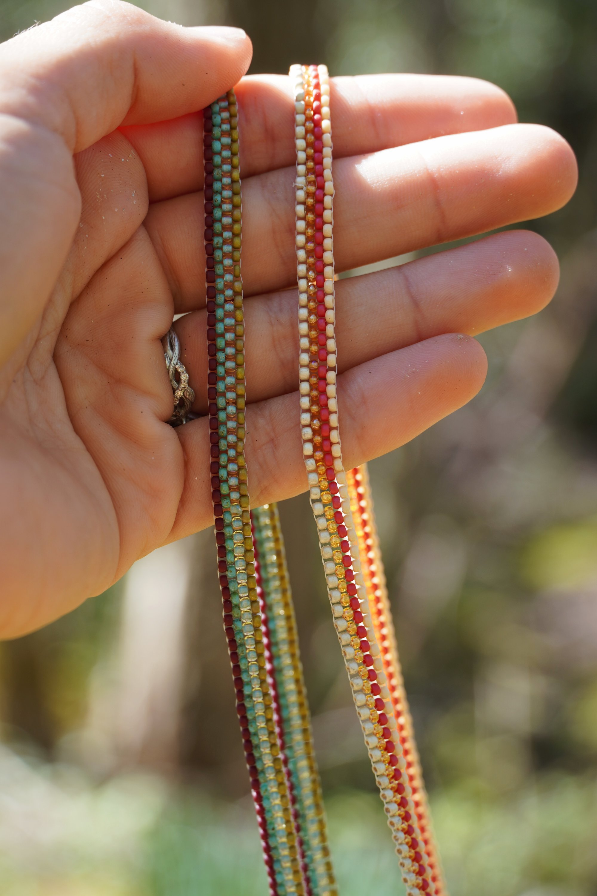 each bead in hand stitched together to make these waist chains using a technique called a peyote stitch. made with glass beads and gold filled materials